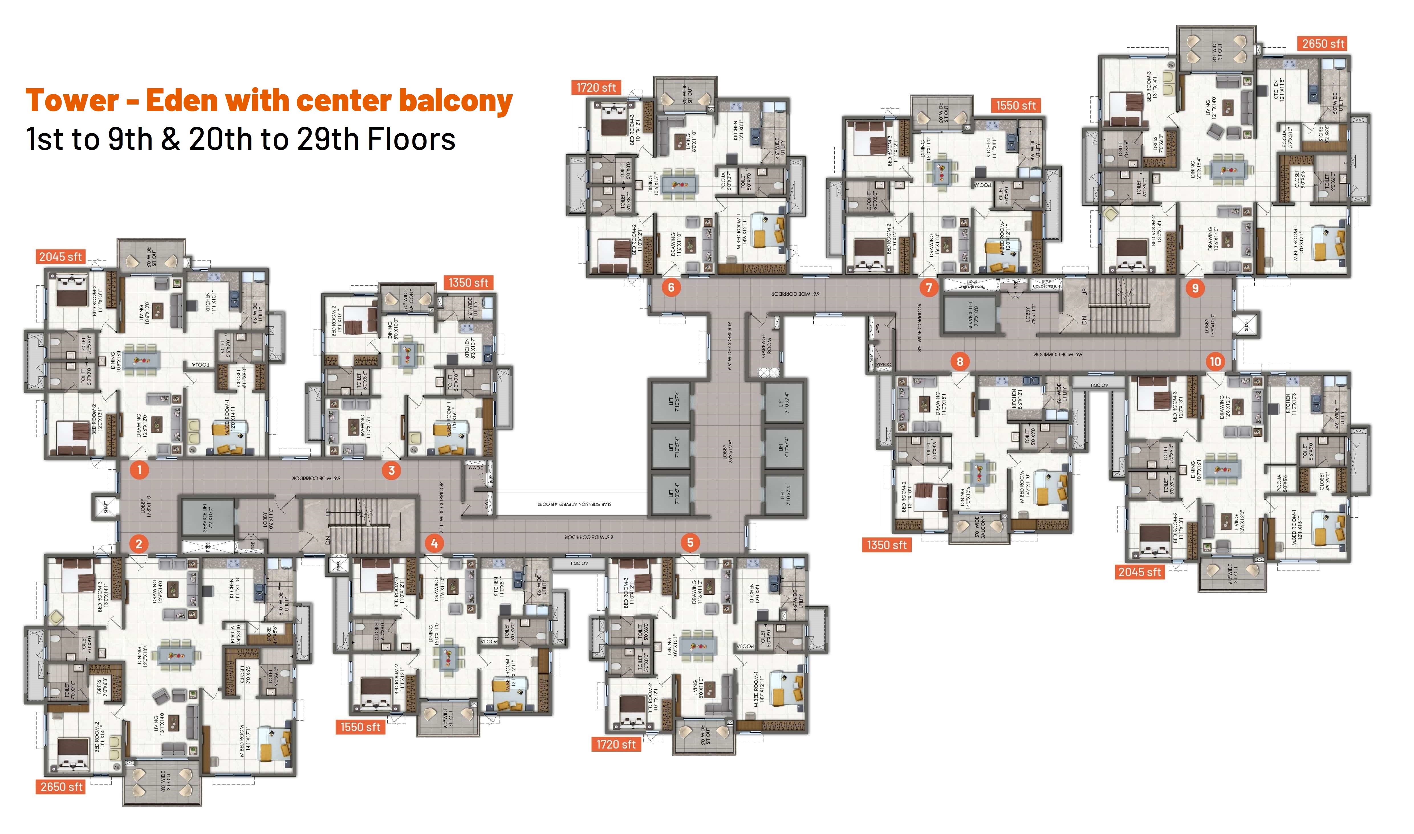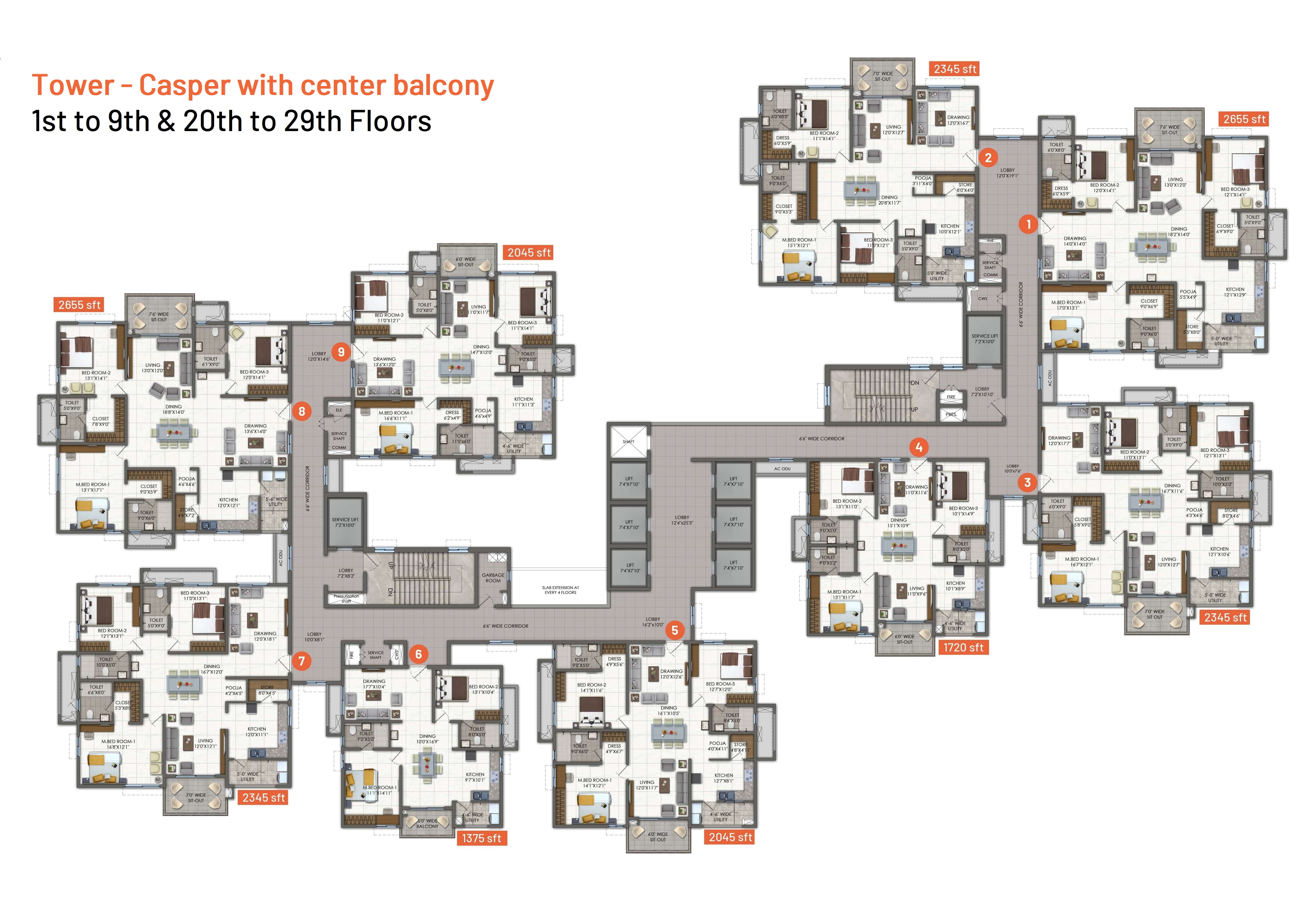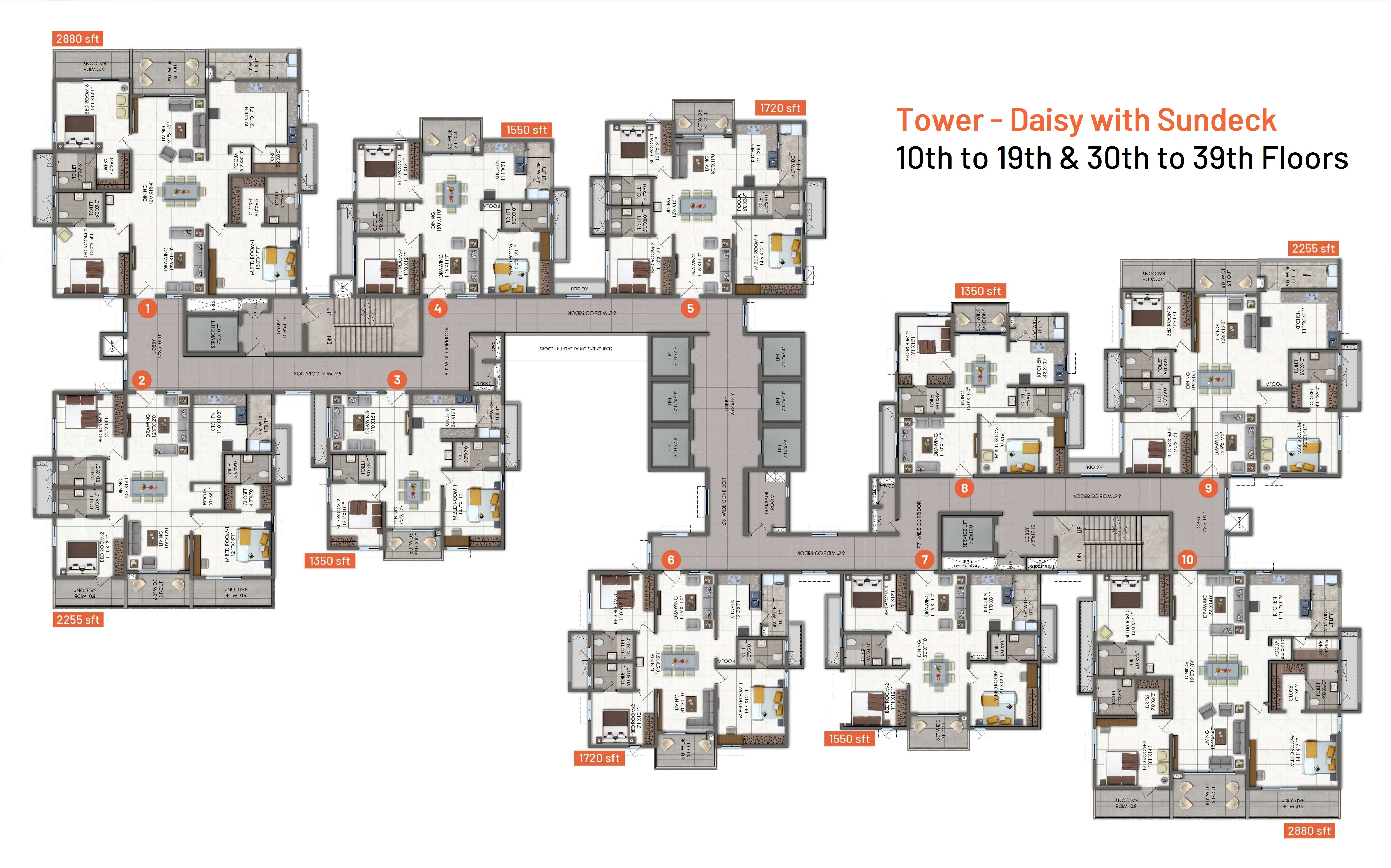 Rajapushpa Imperia offers a total of 3008 high rise apartments with 10 apartment units on each floor. These apartments are spacious and well-designed in 2 BHK & 3 BHK dimensions.